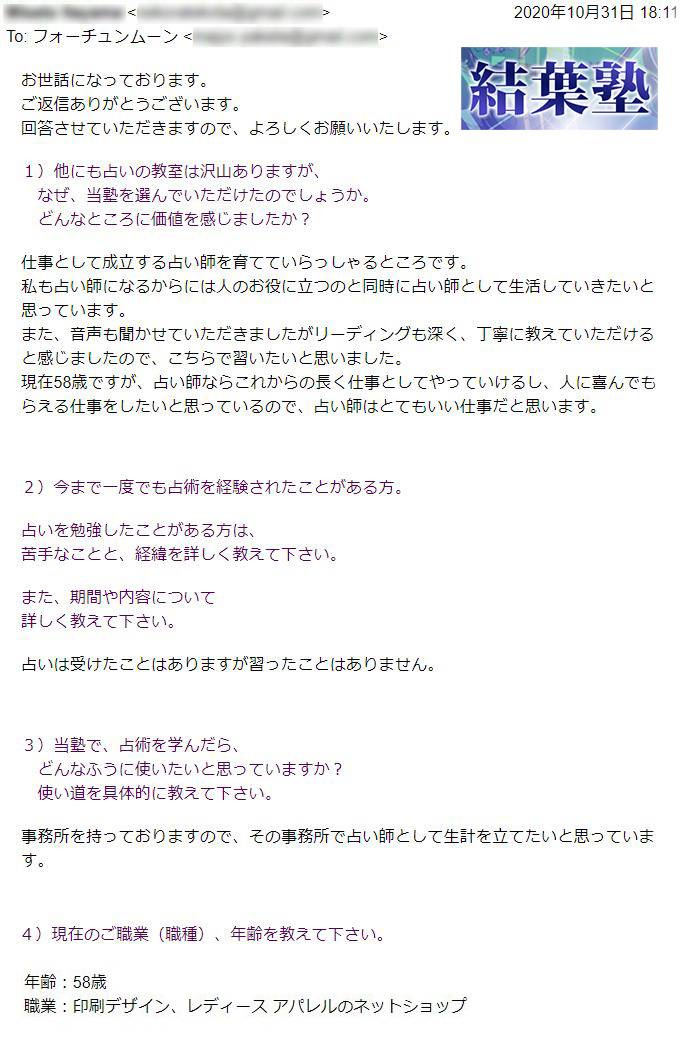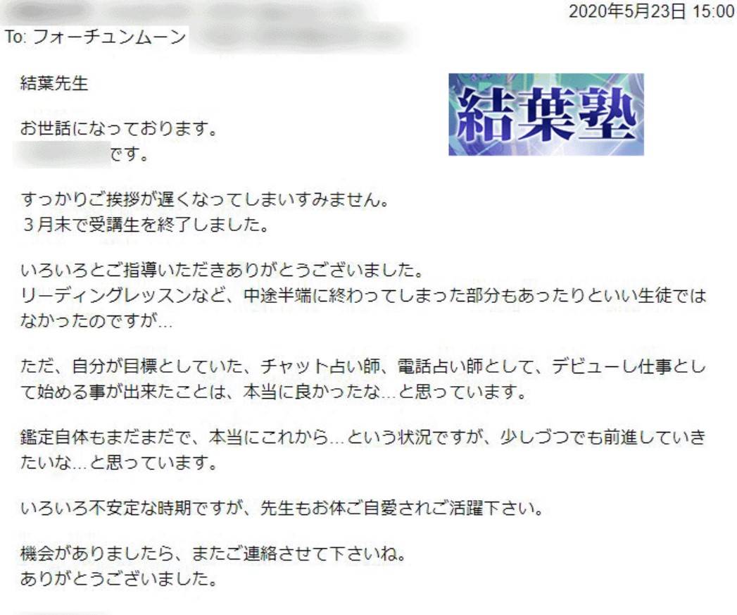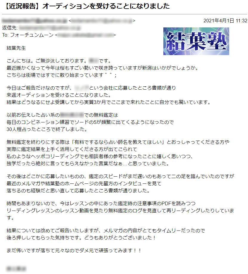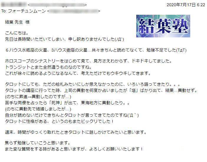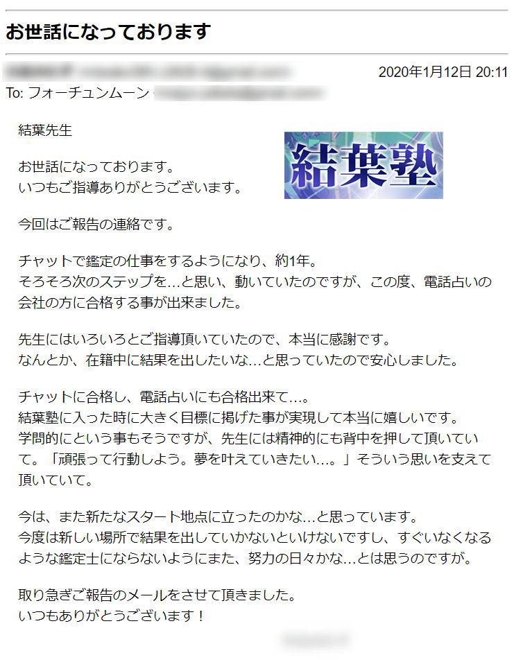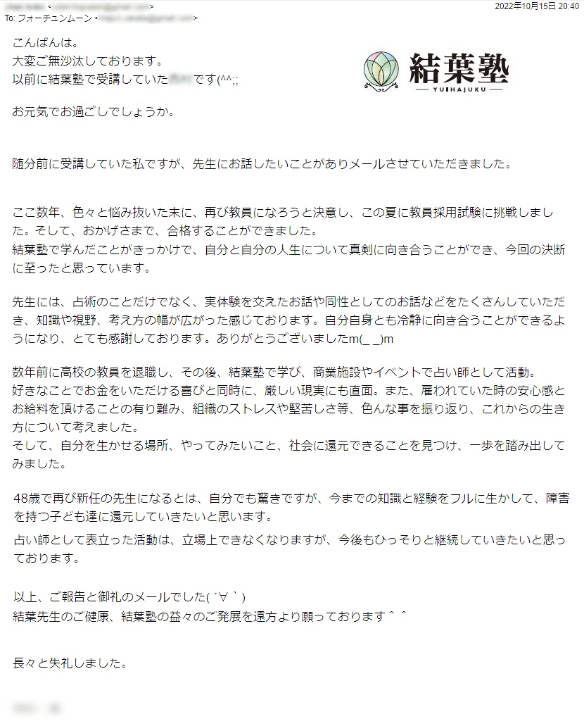 その結果、結葉塾の受講期間内に難関採用試験に合格。夢だったプロ占い師の活動を始めることができました。有名な占いサイトなので、ブランディングになり、今後の活動にもつながりやすくなりました。