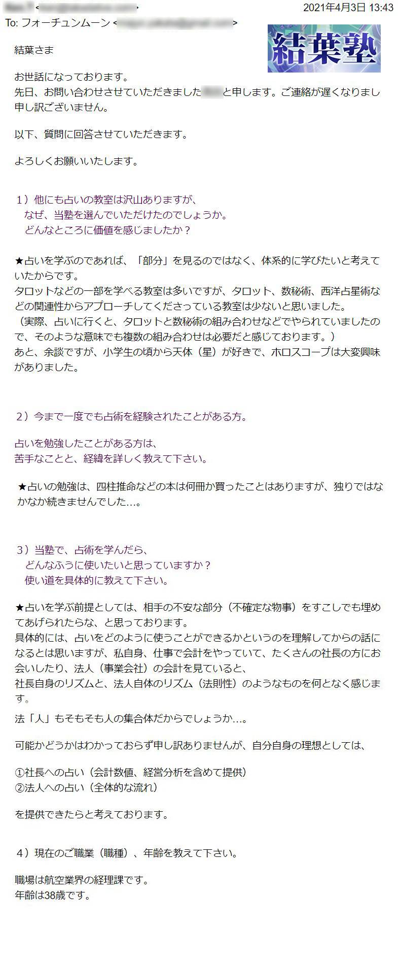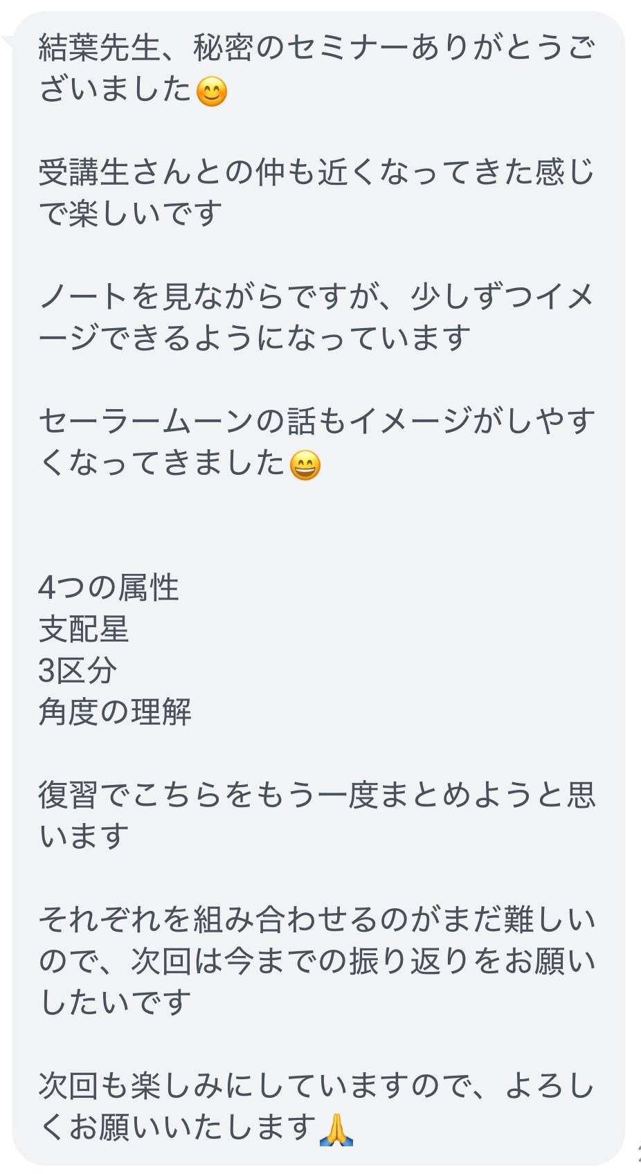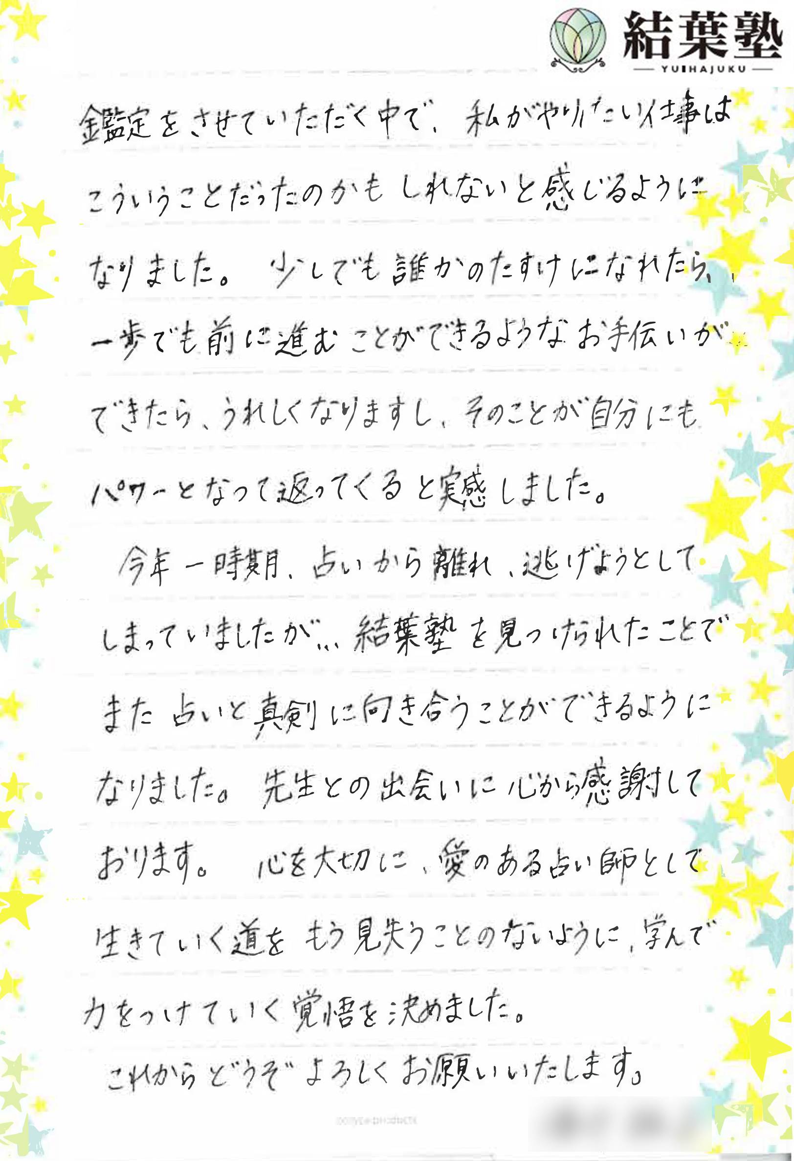 いくつかの占い教室に通いましたが、身につかずに困っていました。どうしても仕事にしたかったので、「最後のチャンスにする」と決めて受講。